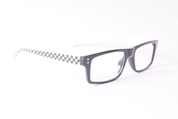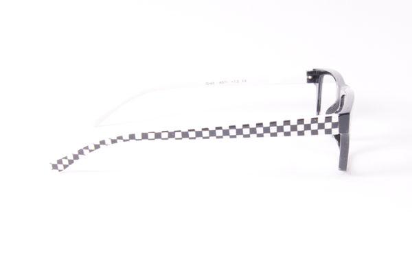 Trendiga läsglasögon med mönstrade svartvita fjäderskalmar.Linsstorlek = Stor