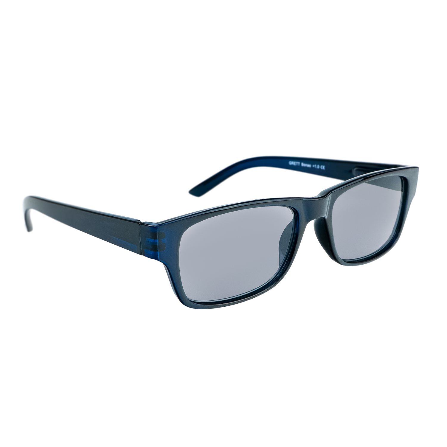 Bonao - Blå läsglasögon med solskydd i en tidlös, rektangulär design.