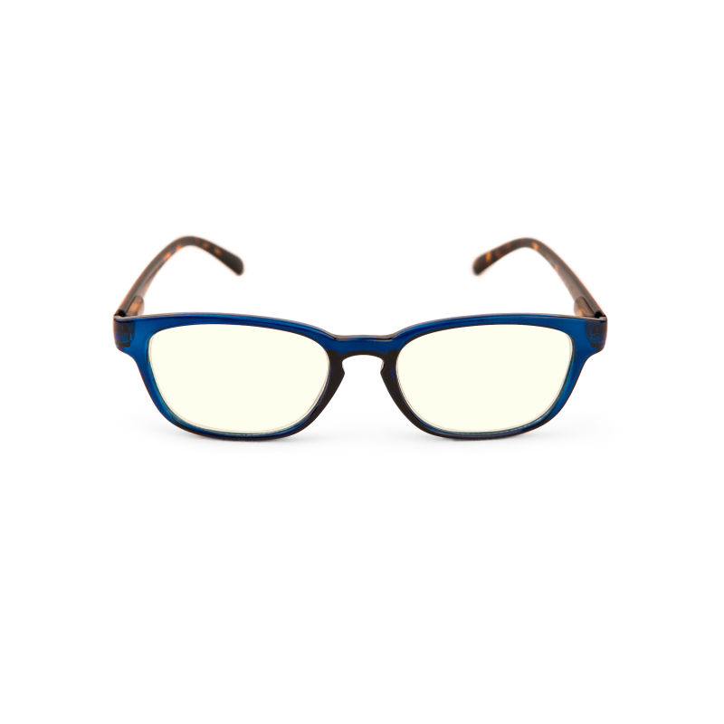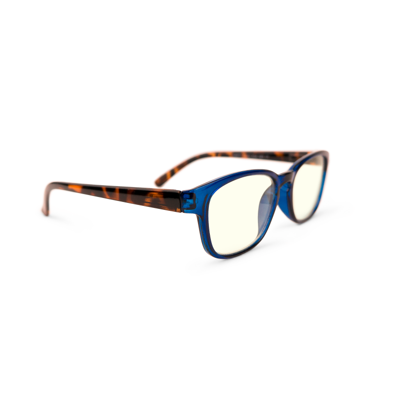 Blå terminalglasögon med lätt gultonat glas, blue light skydd och sköldpaddsmönstrade bågar.