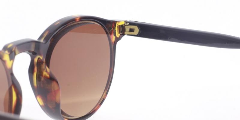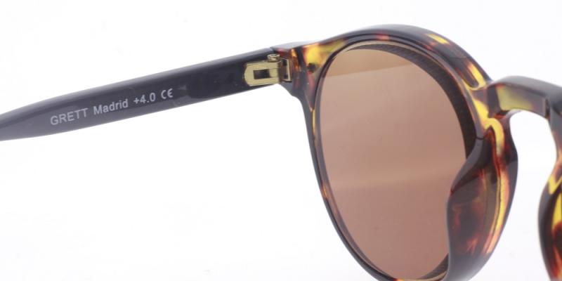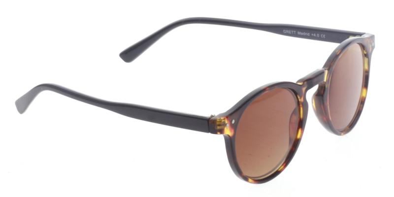 Sköldpaddsfärgade läsglasögon med solskydd. Madrid har fjäderskalmar. Glasögonen levereras med mjukt svart fodral och en putsduk.