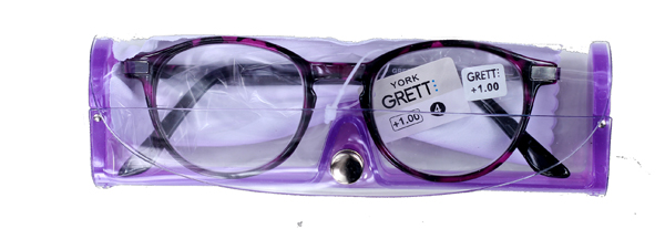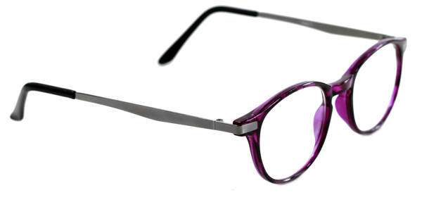 Runda lila läsglasögon i bästa "Harry Potter" stil. Skalmarna är i grå metall.